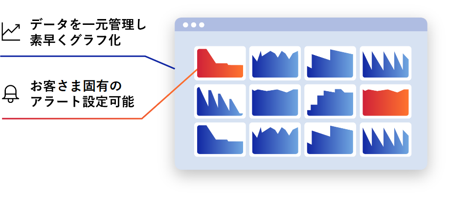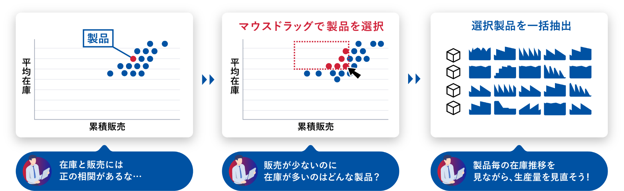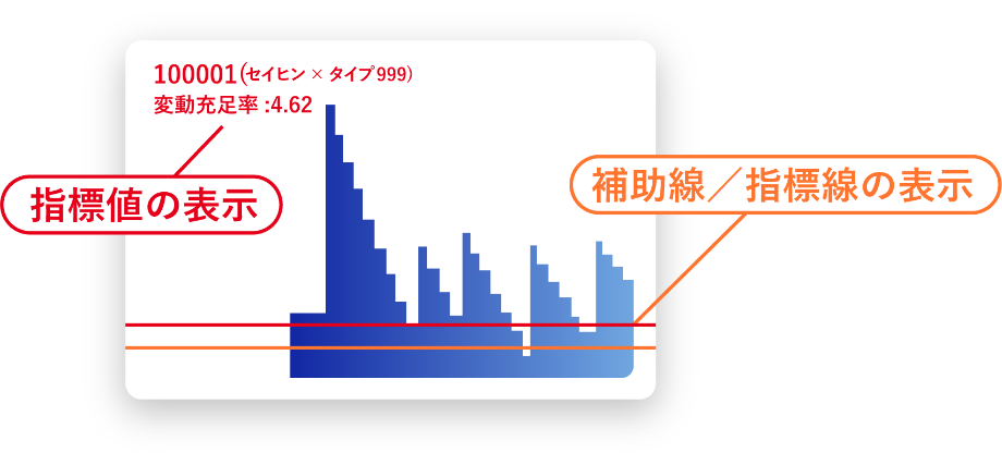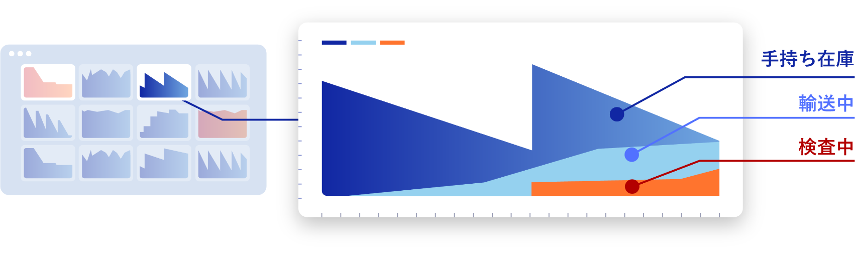 大量な品目に対しても在庫状況をグラフィカルに一覧表示し、過去の在庫推移をもとに在庫異常を早期発見。