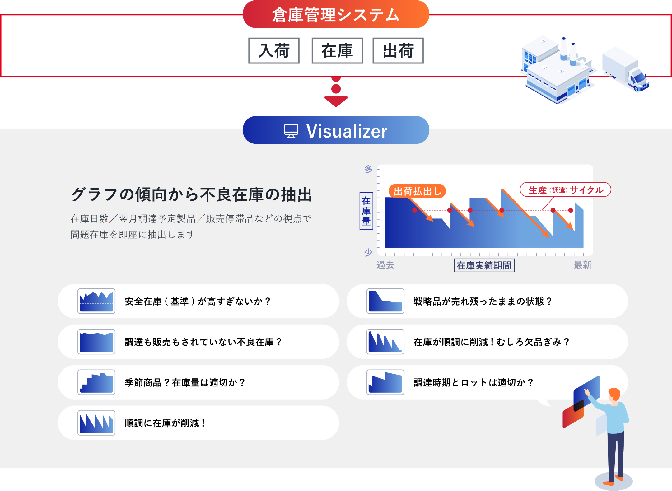 在庫可視化を実現し、効率的に分析・評価を行うシステムです。