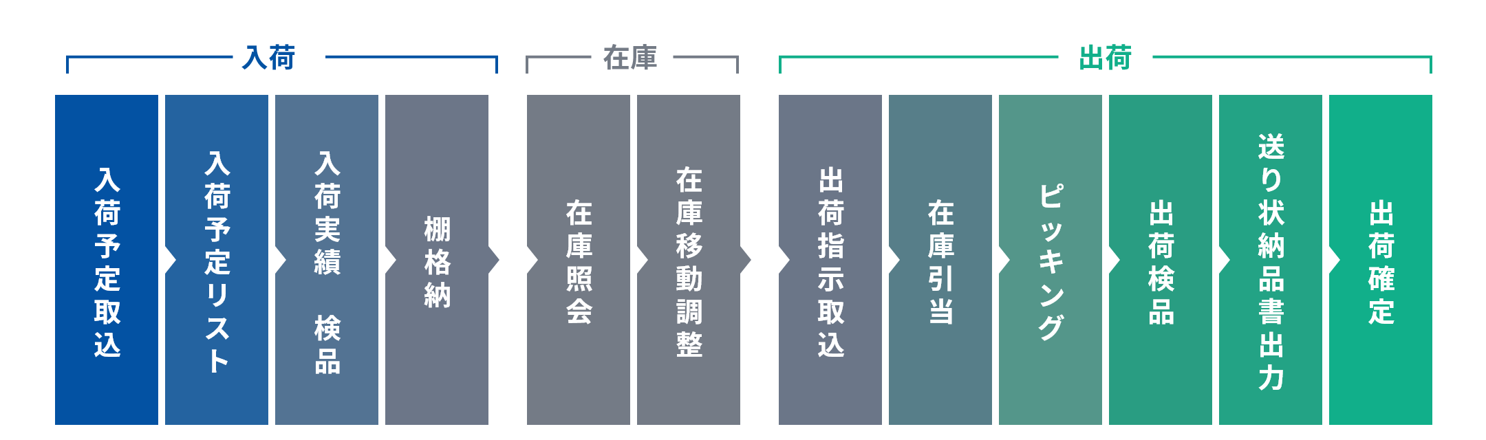 庫内運用に必要な、入荷管理機能(予定取込から検品・棚入まで)、在庫管理機能(問い合わせ、調整/移動、棚卸)、